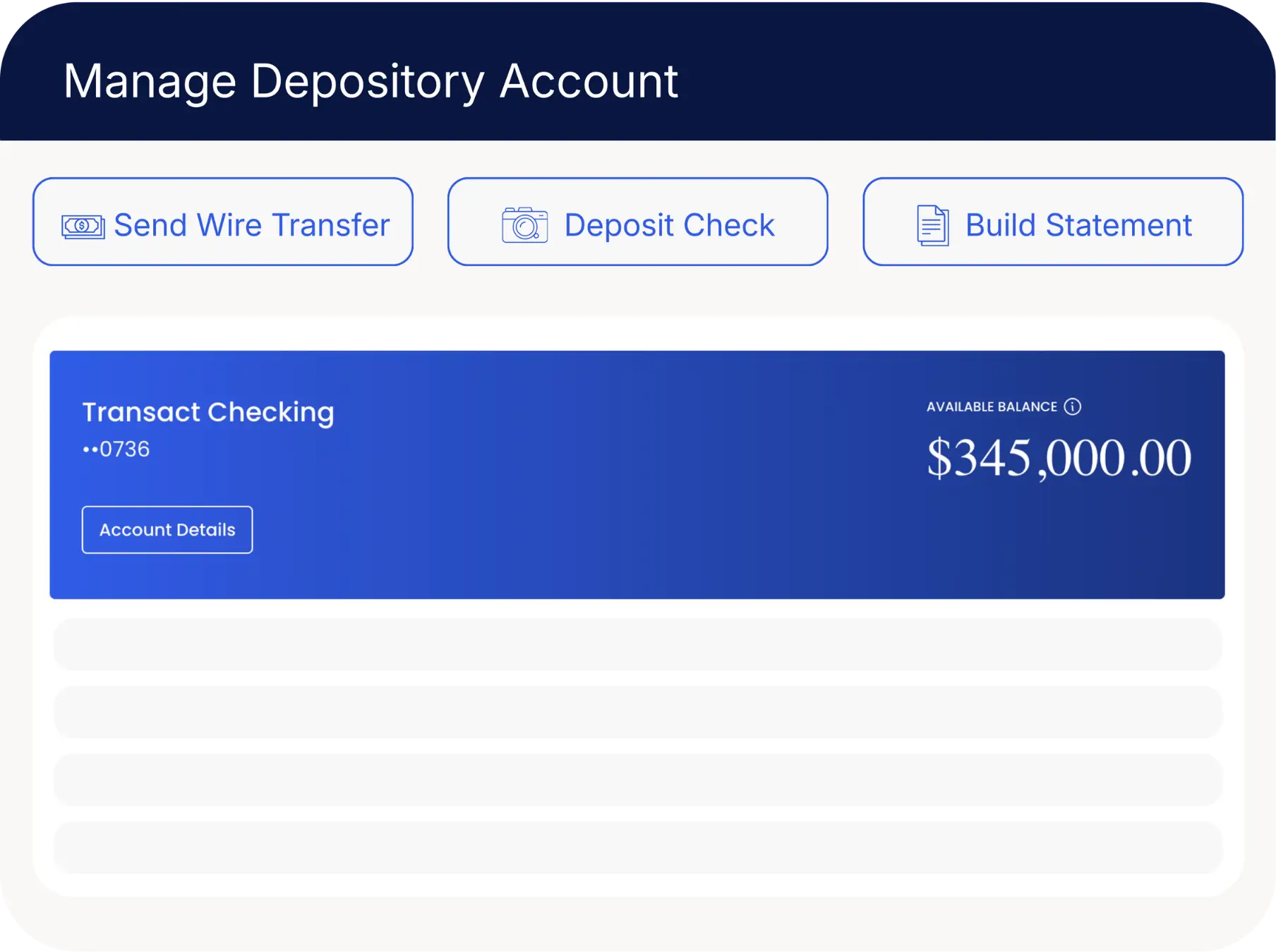 Create and manage an FDIC-insured depository account directly inside InvestNext, typically in one business day. With a Transact account uniquely designed for capital raising, there are no bank appointments to schedule, no branch visits, and no need to navigate unfamiliar external portals.